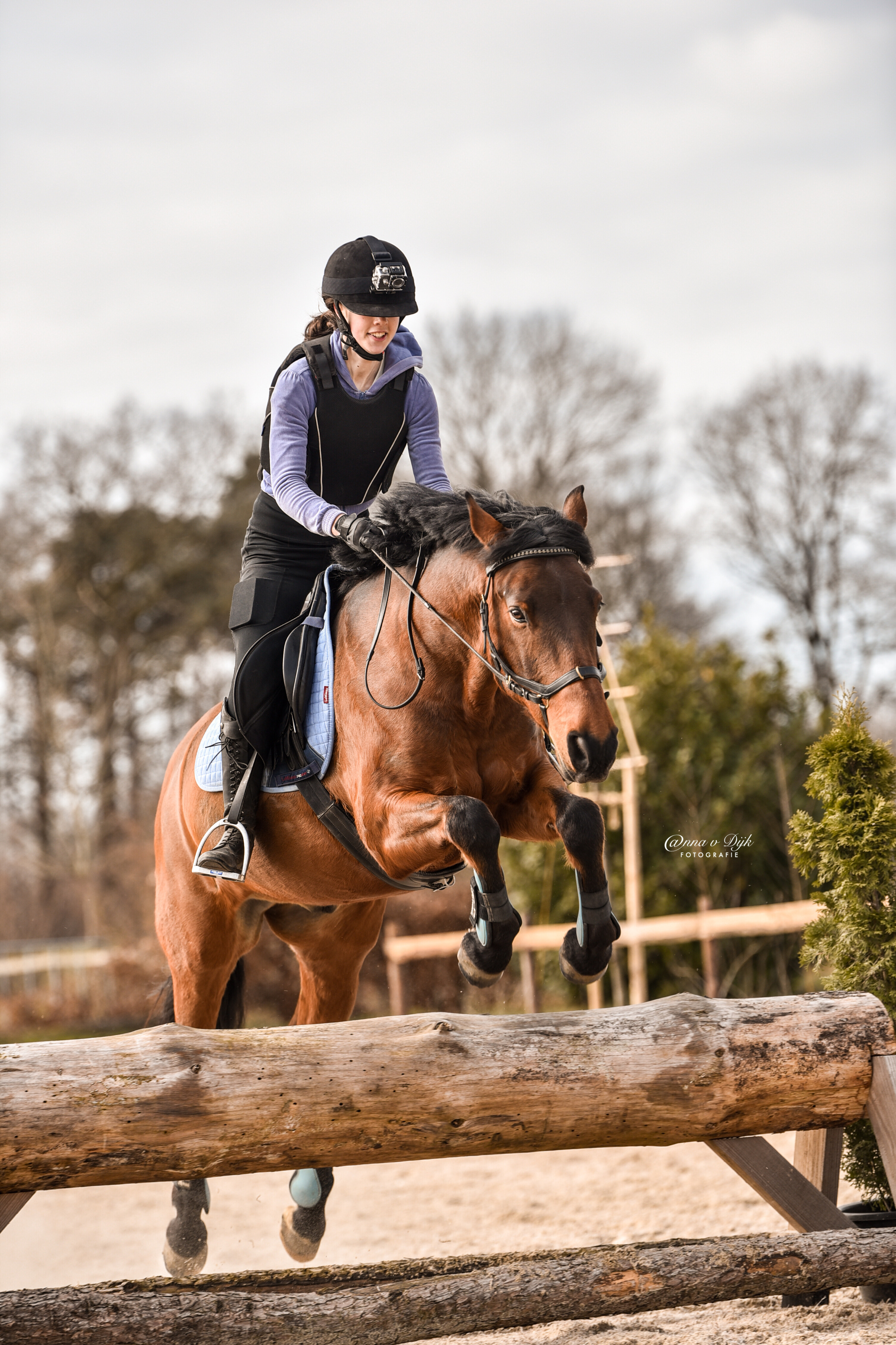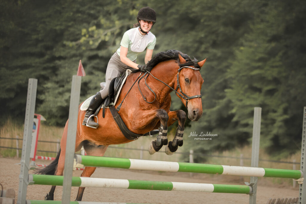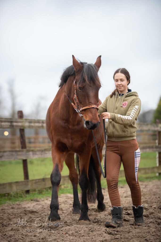 Toen ik dertien was, ontmoette ik mijn beste maatje en leermeester: Karel. Hij leek aan de buitenkant rustig en braaf, maar ik voelde al snel dat er iets miste. Zijn “rust” was eigenlijk een muur – een manier om zich af te sluiten van echte verbinding. Ik ging op zoek naar manieren om hem te helpen zich open te stellen en leerde alles over subtiele stresssignalen en hoe belangrijk het is om te luisteren naar wat een paard écht nodig heeft. Gaandeweg groeiden we naar elkaar toe, en de band die we nu hebben is sterker dan ik ooit had durven dromen. In de loop van de tijd heb ik met Karel van alles gedaan: dressuur, springen, crossen, tuigloos rijden, veel grondwerk. Recent heb ik hem zelfs beleerd voor de menwagen.